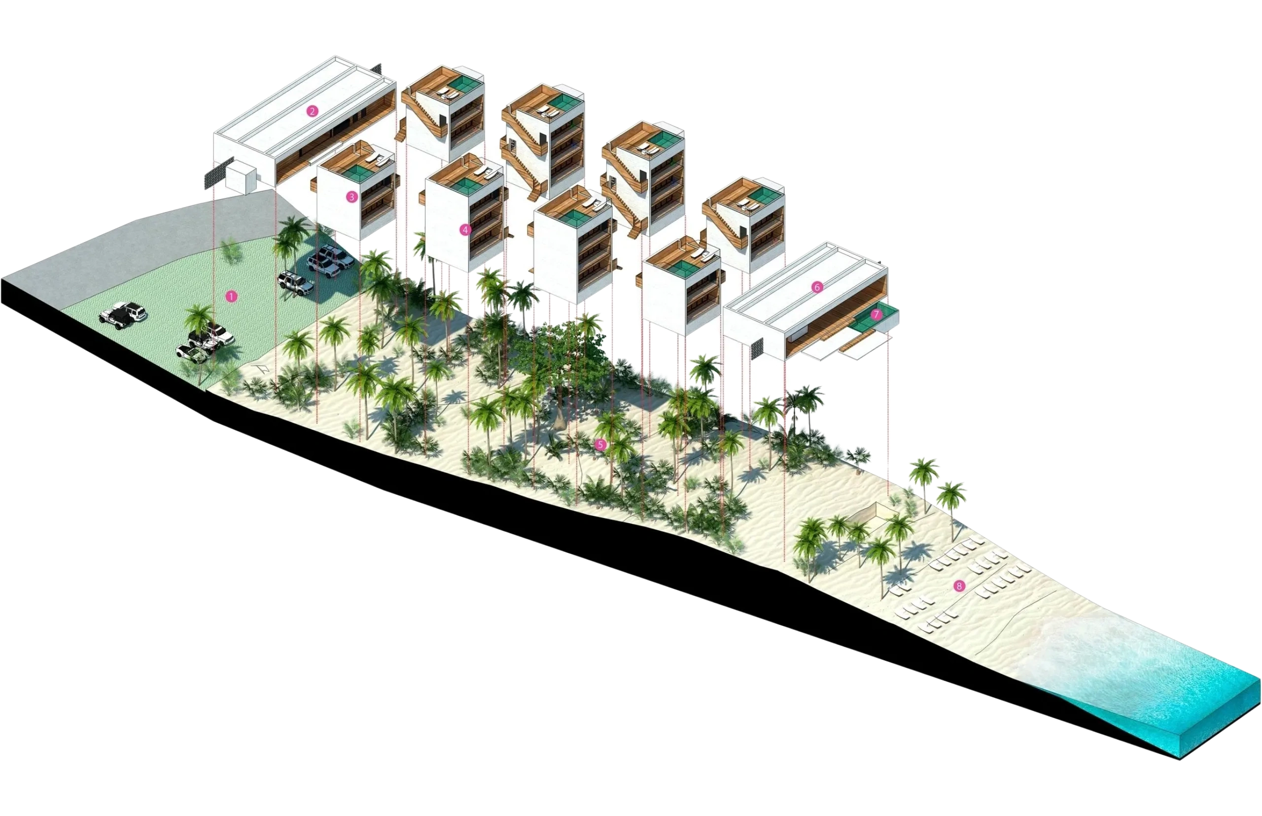 Este hotel busca crear una oferta de lujo y bienestar para el ecoturismo internacional. El producto adapta su tipología y lenguaje al desarrollo costero de Tulum.