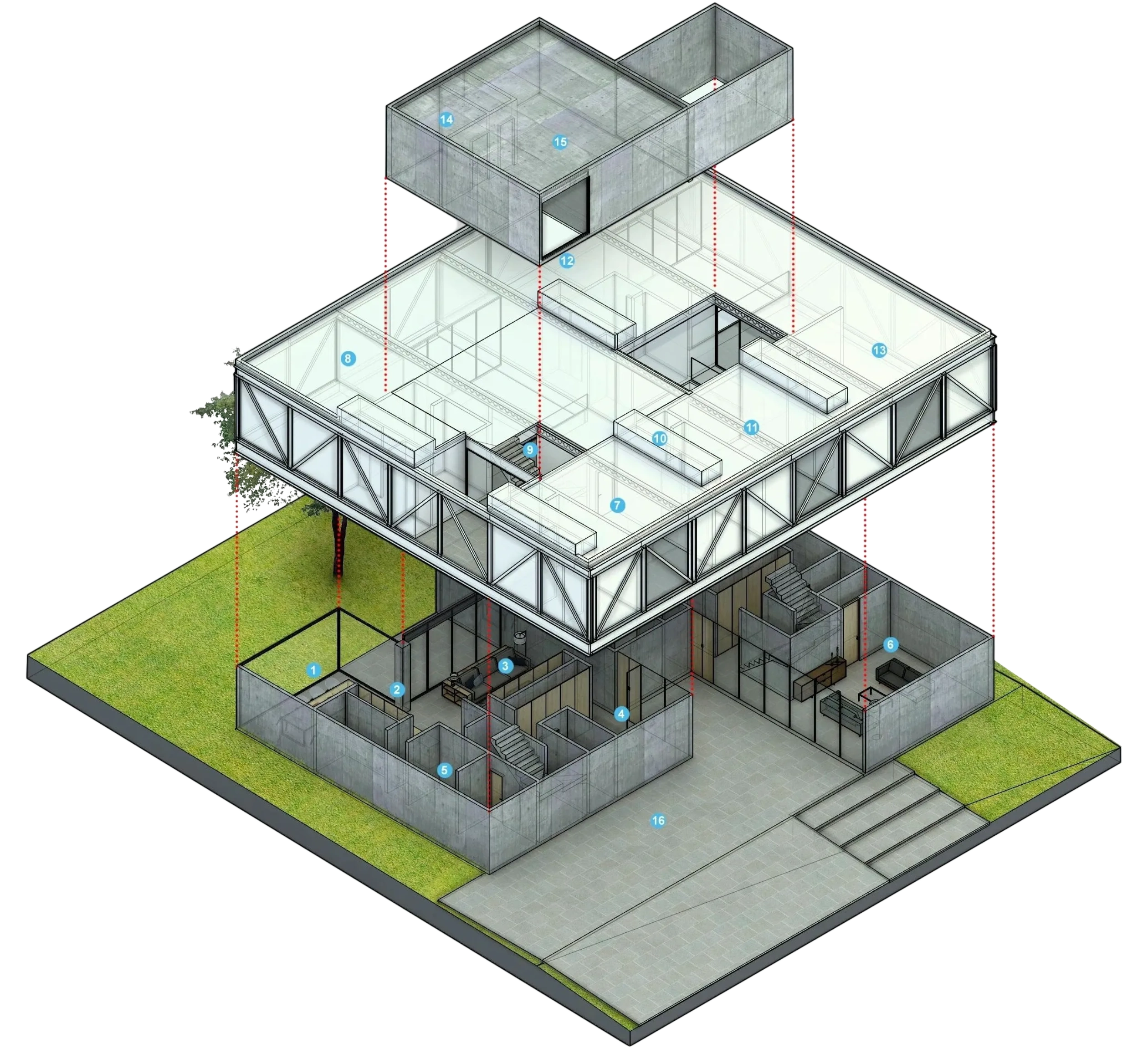 This program comprises two homes in one, suiting specific and common needs. Garage and garden are shared areas; lobby and terraces organize the entrances.